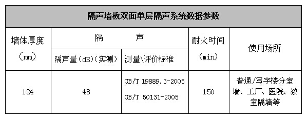 無(wú)機(jī)高強(qiáng)隔聲墻板單板隔聲為30dB,可通過(guò)不同的結(jié)構(gòu)系統(tǒng),將隔聲量提高,分別有雙面單層(48dB)、雙面雙層(52dB)、雙面雙龍骨五層(59dB)等。具體數(shù)據(jù)如下: